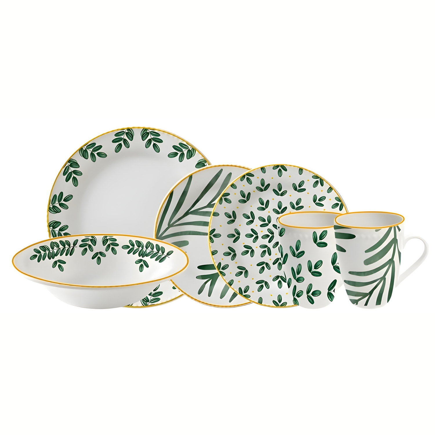 Aparelho de Jantar 16 Peças Salvia – Linha Corona | Cerâmica Decorada com Folhagens Verdes