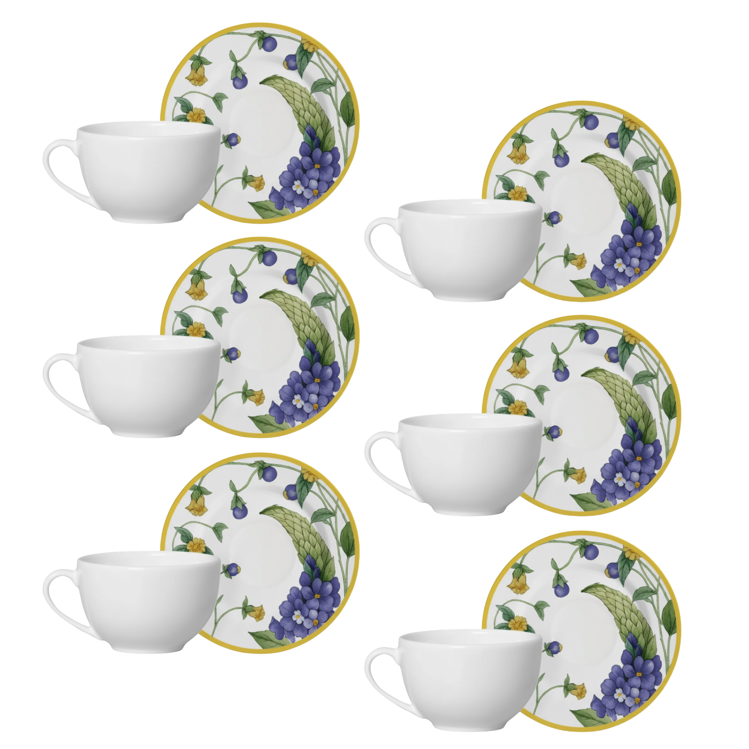 Cada xícara, com capacidade de 250 ml, acompanha um pires decorado no mesmo tema floral, criando uma composição harmoniosa e encantadora — perfeita para servir chás, cafés e infusões com elegância.