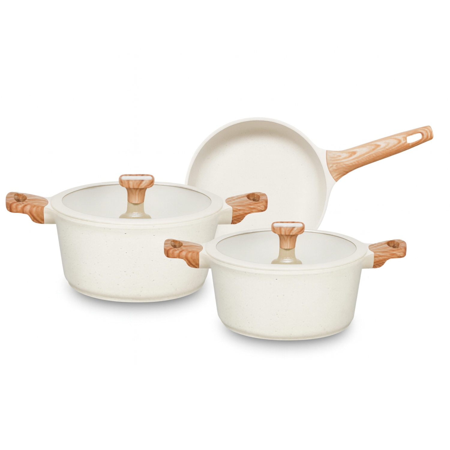 Com design elegante na cor vanilla, o conjunto traz cabos e alças com toque macio (soft-touch), oferecendo conforto e segurança no manuseio. As tampas de vidro temperado com borda de silicone ajudam a manter o calor e o sabor dos alimentos durante o preparo.