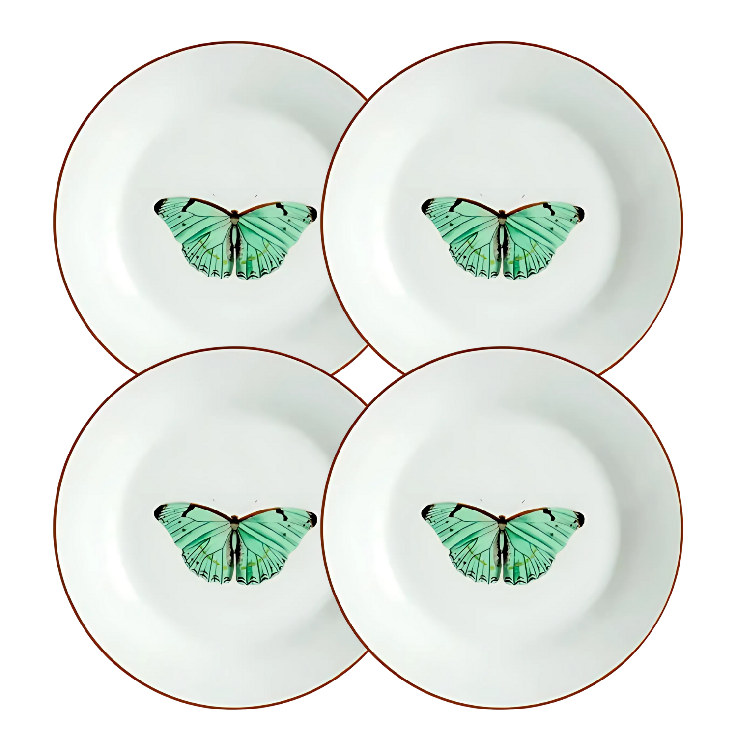 Jogo de Pratos 4 Peças Borboleta em Porcelana com Borda Marrom – Encanto Natural e Sofisticação à Mesa