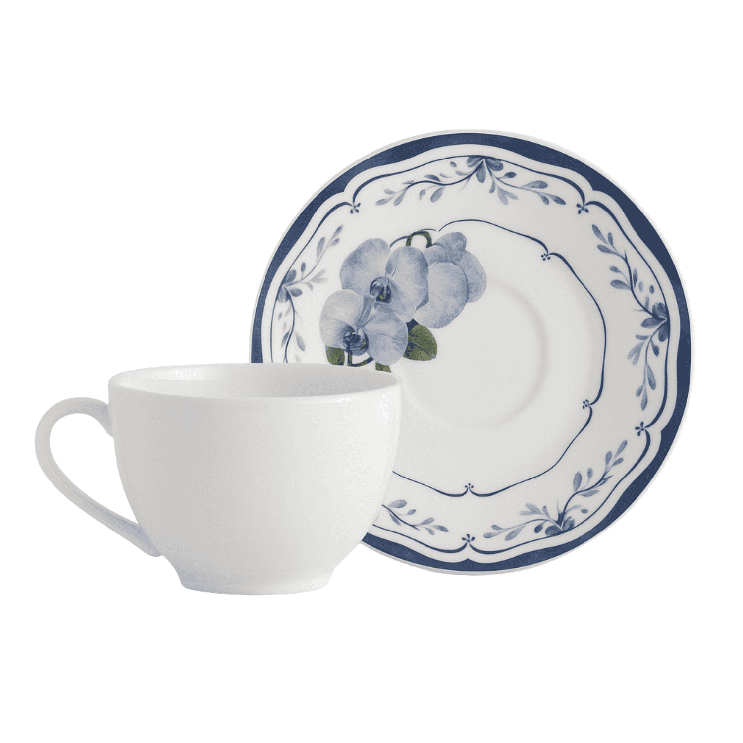 Fabricada em cerâmica feldspática branca de alta resistência, a peça garante durabilidade, brilho e praticidade no uso diário. O conjunto apresenta uma xícara com formato ergonômico e um pires de borda delicadamente curvada, criando uma composição refinada que valoriza o ritual do chá.